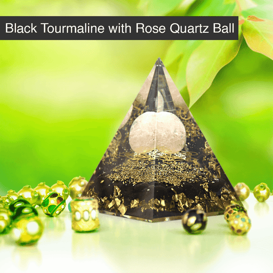 Designer Crystal Pyramid, Black Tourmaline base with Rose Quartz Ball In Wooden Gift Box